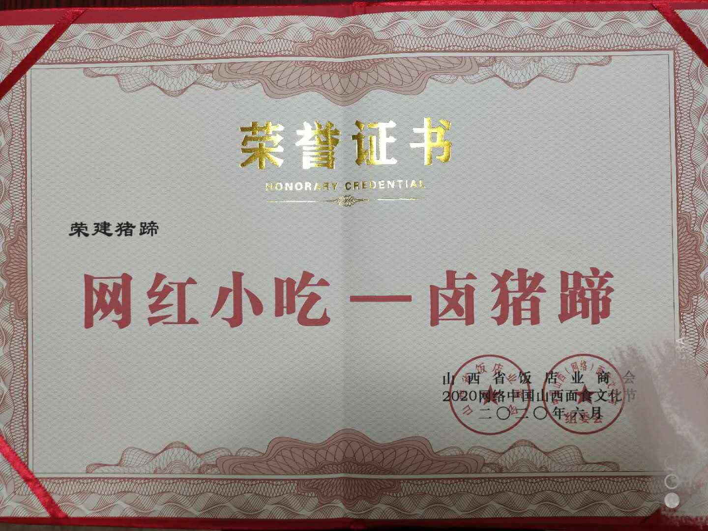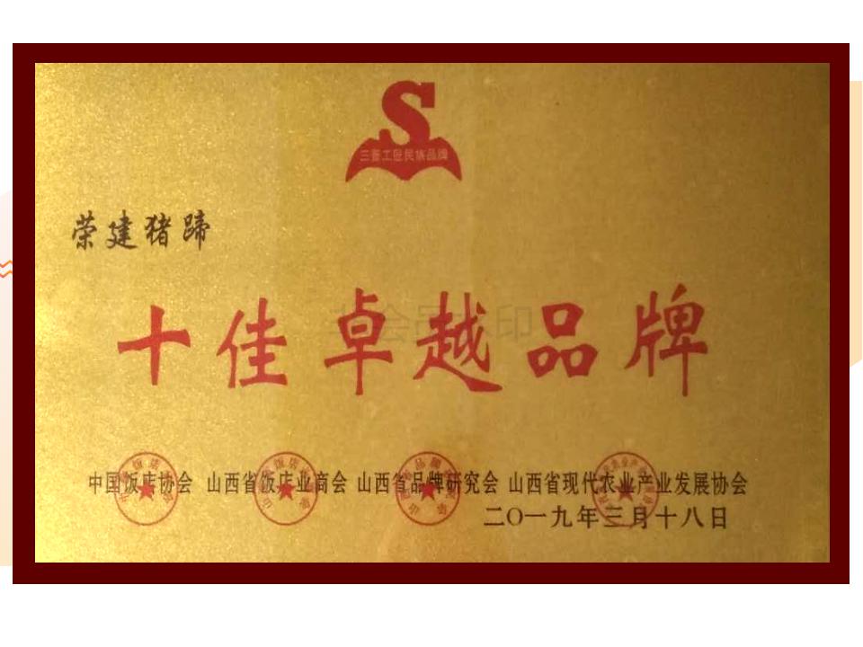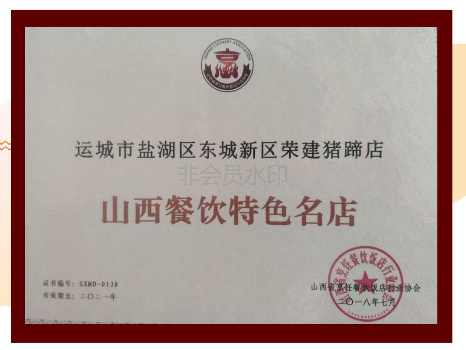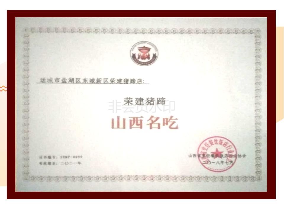 介氏餐饮品牌“荣建猪蹄”初始于1998年,由介子推寒食节忠孝文化第103代传承人介荣建创立。原名荣建面餐馆,以农家菜和面食为主,因特色菜--卤水猪蹄口味独特,营养价值高,老少皆宜而深受广大食客的喜爱,每天慕名而来的食客络绎不绝,为方便各地食客寻找,于2005年5月更名为“荣建猪蹄”店,同年10月成功注册。因良好的口碑和消费者的认可,“荣建猪蹄”因此成为夏县的一道名吃。
